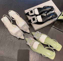 2022年レディースハイヒールサンダル新デザイン先の尖ったつま先ラインストーンスクエアバックルミディアムヒールオフィス & ウェディングシューズ夏用