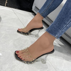 2022 Sandalias de tacón alto para mujer, nuevo diseño, punta estrecha, diamantes de imitación, hebilla cuadrada, tacón medio, zapatos de oficina y boda para el verano